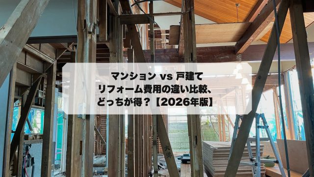 articles マンション vs 戸建て|リフォーム費用の違い比較、どっちが得?【2026年版】 4月 18, 2026 てけ https://chuko-renove.life/wp-content/uploads/2021/10/中古リノベ.life_.png 戸建てリフォーム・リノベライフ 「同じキッチン交換なのに、友人のマンションと自分の戸建てで見積もりが全然違った」という話を、リフォームを経験した人から何度か聞いた …