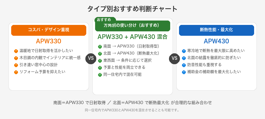 - 東面・西面の窓 → APW330(日射遮蔽型)またはAPW430。夏の朝日・西日対策を優先するか、断熱を優先するかで判断する。