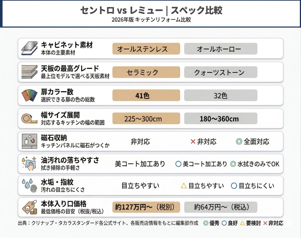 ショールームで両方見てきたけれど、どちらにすべきか決められない。そんな声をよく聞きます。クリナップ セントロとタカラスタンダード レミューは、どちらも「長く使える高耐久キッチン」をうたうハイエンドモデル。しかし素材の思想がまったく逆で、選ぶべき人の像もはっきり分かれます。