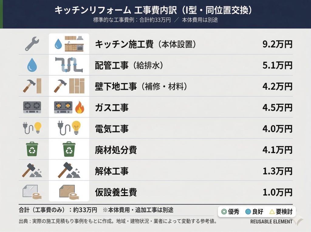 I型・同位置交換の標準的な工事費は25〜35万円程度が目安です。内訳はキッチン設置・配管・ガス・電気・解体・廃材処分などです。ガスからIHへの切り替えが必要な場合は3〜8万円が追加されます。