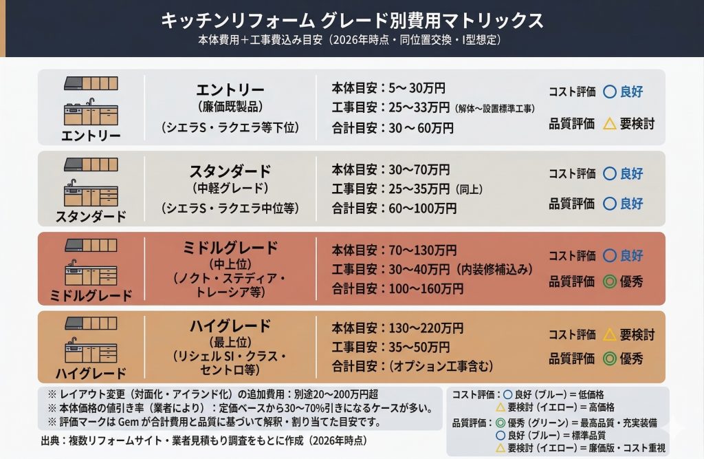 キッチンリフォーム費用相場|グレード・工事内容・選び方を比較【2026年版】