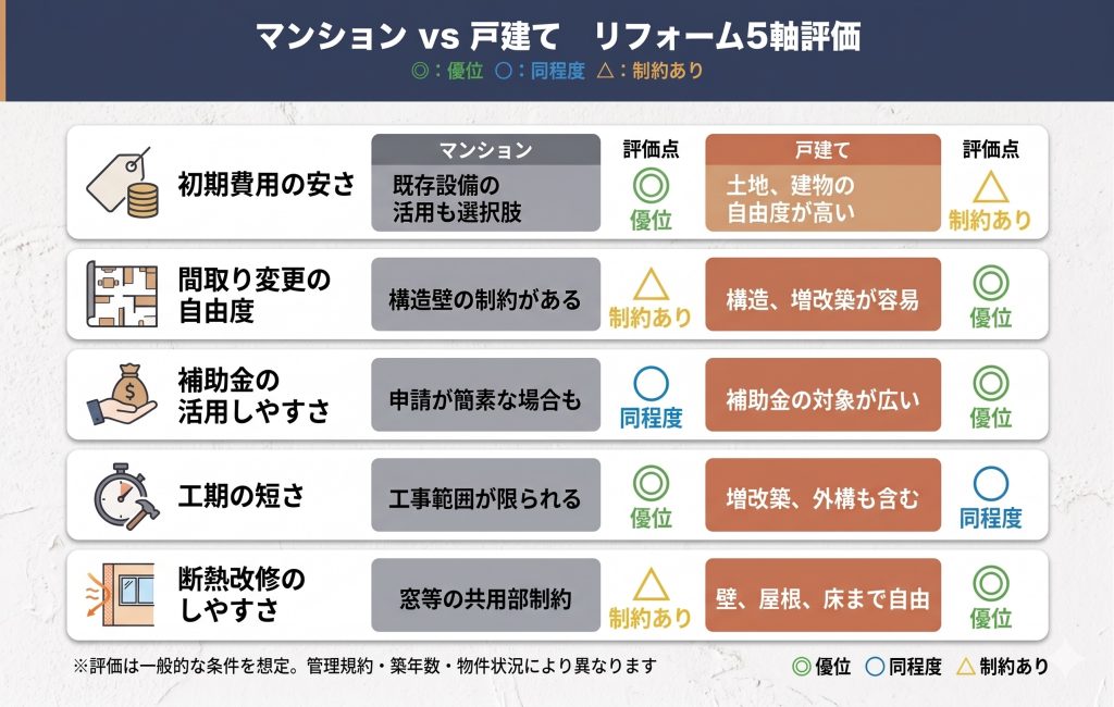 マンションと戸建てでは、リフォームできる範囲・工事の制約・補助金の使いやすさが根本的に異なります。単純に「どちらが安いか」を比べるより、なぜ差が出るのかを理解することが、費用を正確に見積もり、予算を賢く使う第一歩になります。