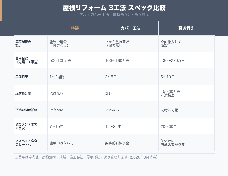 足場費用に加え、既存屋根材の撤去費・廃材処分費(15〜30万円)・防水シート費・新しい屋根材の費用・施工手間賃が積み上がります。アスベスト含有スレートが発覚した場合は、石綿含有廃棄物の特別管理産業廃棄物としての処理費用が別途20〜50万円発生することがあります。一方で、野地板の腐朽補修を同時施工できるため、発見された損傷の規模によっては葺き替えがトータルで最も合理的な選択になります。長期的に見れば次のメンテナンスまでの年数が最も長いため(20〜30年)、1回あたりの工事費は高くても20〜30年スパンの年間コストは最も低くなるケースがあります。