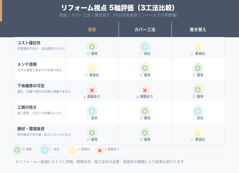 中古住宅の屋根リフォームで最初に決めなければならないのが「塗装で延命するか、カバー工法(重ね葺き)にするか、全面葺き替えにするか」という工法の選択です。結論から言えば、スレートの劣化が軽度で下地が健全なら塗装、板材が傷んでいるがカバー工法が使える状態であれば費用対効果の高いカバー工法、下地の腐朽や雨漏りが進んでいる場合やアスベスト含有スレートの撤去が必要な場合は葺き替えが適しています。この判断は屋根材の種類より先に決まる話で、どの工法を選ぶかによって費用・工期・次のメンテナンスまでの年数が大きく変わります。工法の特性と自分の屋根の状態を正確に照らし合わせることが、後悔のない屋根リフォームの第一歩です。